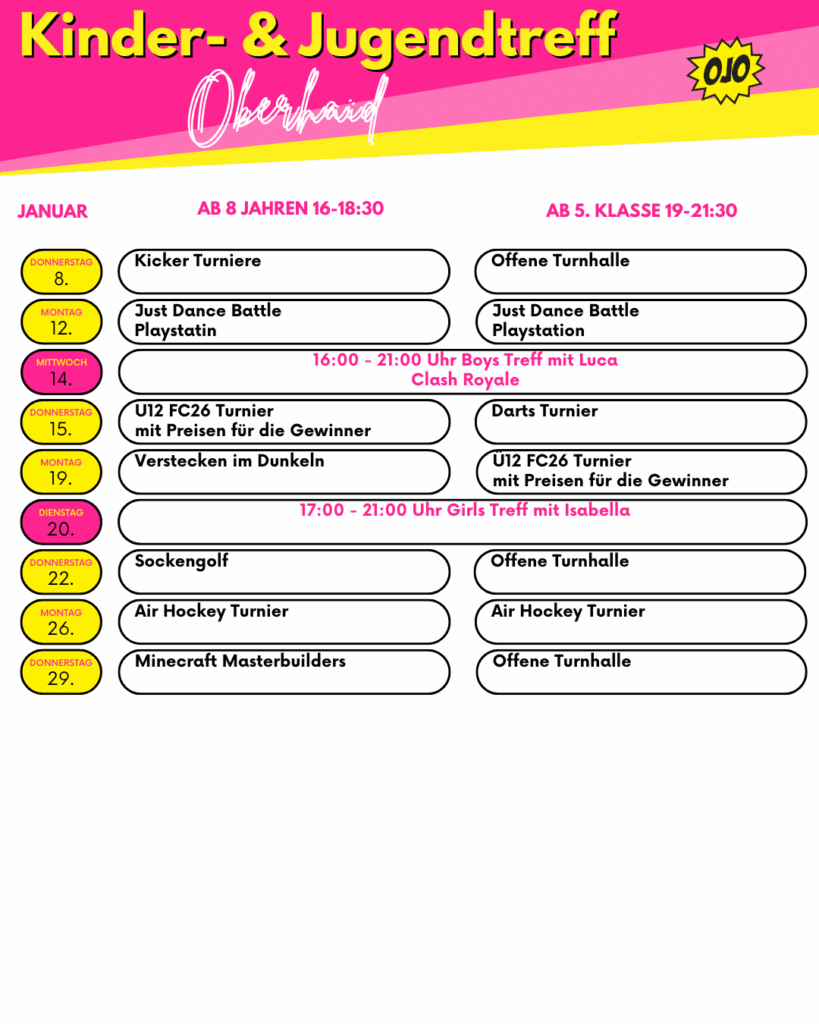 Bereit für das Januar Programm im Kinder- und Jugendtreff? Wir hoffen ihr hattet schöne Ferien und könnt jetzt erholt ins neue Jahr starten. Es gibt diesen Monat wieder einige beliebte Aktionen im Jugendtreff. Für „Oberhaid schnappt Mr X“ wäre es gut, wenn ihr ein Smartphone mit WhatsApp dabei habt. Es geht aber auch ohne. Für ...